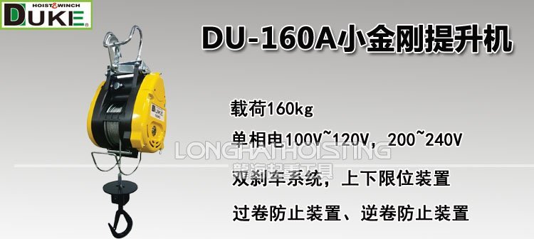 * 臺灣DUKE DU-160A小金剛提升機采用工業級高效率激式/永磁式碳刷馬達,有兩款單相電壓選擇配置(100V~120V/200~240V)。